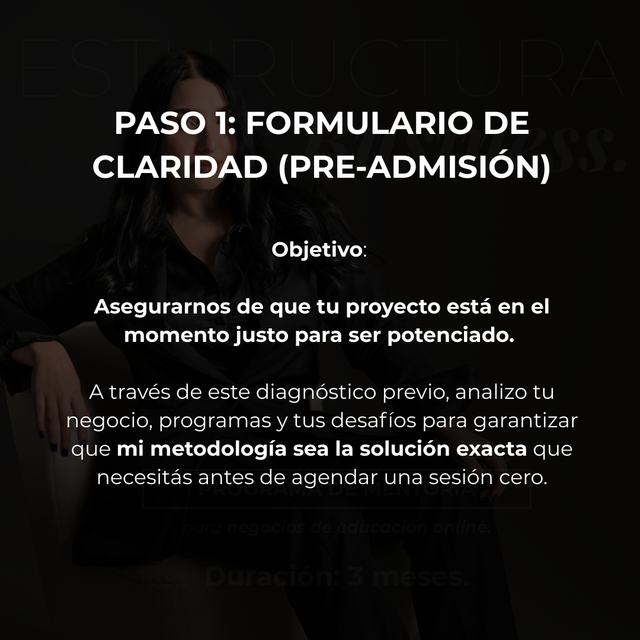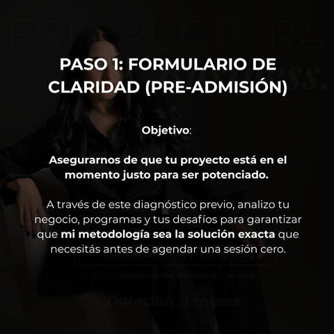 Todo comienza antes de nuestro primer encuentro. Primero, completarás un Formulario de Calificación donde analizaremos tu situación actual, tus dolores y tu facturación.