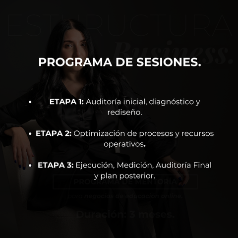 Consiste en un proceso de 6 sesiones estratégicas donde yo actúo como tu Directora Académica Externa, asegurando que cada pieza de tu programa sea de calidad y aporte valor real a tus clientes.